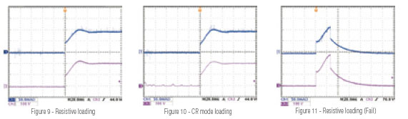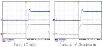 LED driver的輸出漣波電流可以透過(guò)調(diào)整63110A內(nèi)部電阻 (Rr) 來(lái)模擬。傳統(tǒng)電子負(fù)載無(wú)法模擬LED driver的輸出漣波電流,如圖6所示。圖7為LED當(dāng)負(fù)載時(shí)的漣波電流。圖8為63110A當(dāng)負(fù)載時(shí)的漣波電流。 圖9是以真實(shí)電阻為負(fù)載的拉載電流波形(藍(lán)色);圖10為定電阻模式模擬真實(shí)電阻的拉載電流波形(藍(lán)色);圖9與圖10的電流與LED為負(fù)載的電流波形有相當(dāng)大差異,且電流及電壓都有過(guò)沖的情況發(fā)生,易導(dǎo)致LED driver在開(kāi)機(jī)時(shí)發(fā)生過(guò)電壓或過(guò)電流保護(hù),如圖11所示。因此不管是真實(shí)電阻或是電子負(fù)載的定電阻模式,都比較無(wú)法模擬真實(shí)的情況。